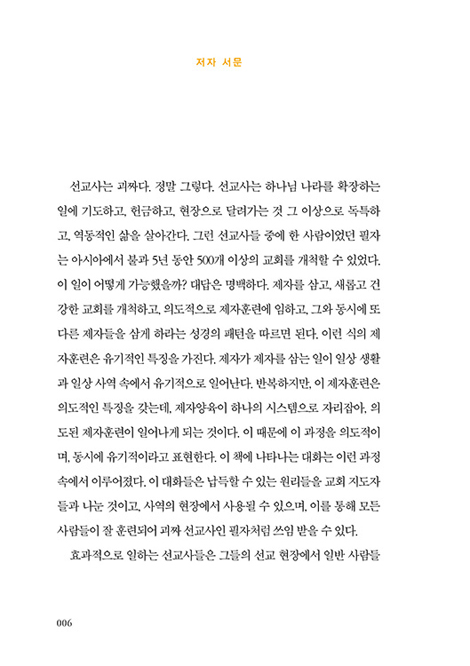 이 책의 저자 J.J. 파머는 자신의 재생산하는 제자 훈련사역의 경험과 그 방법을 자세하게 말한다. 그것은 자신과 현지 사역자들, 그리고 미국 본토의 사역자들과의 대화 내용에 대한 기술을 통해 우리에게 생생하게 전달된다.