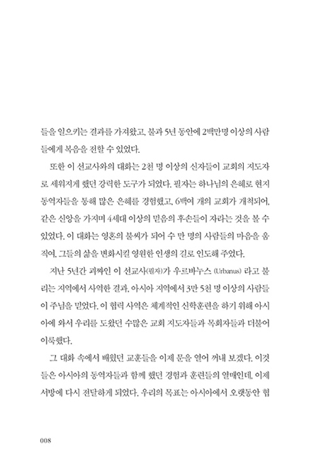 여기서 나누는 대화는 다른 배경, 다른 나라, 다른 대륙, 다른 언어, 다른 경제적 상황에서 생겨난 것이다. 이 대화는 성령의 역사로 말미암아 하나의 아이디어에서 시작하여 생명력 있는 힘으로 자라왔고, 아시아에서 수많은 믿는 자들을 일으키는 결과를 가져왔으며, 불과 5년 동안에 2백만 명 이상의 사람들에게 복음을 전할 수 있었다.