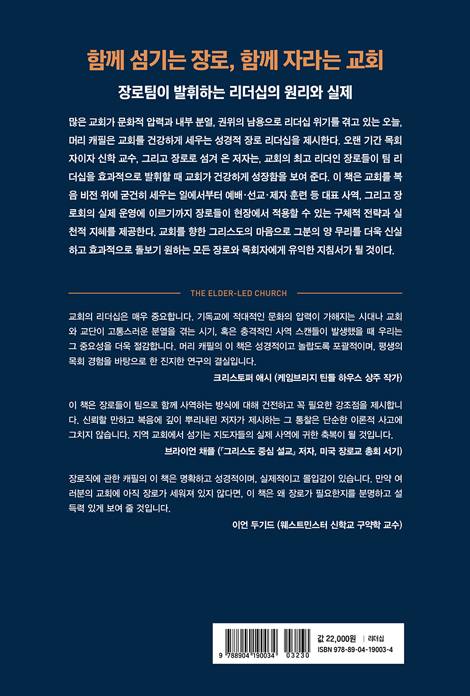 장로직에 관한 캐필의 이 책은 명확하고 성경적이며, 실제적이고 몰입감이 있습니다. 장로님들께 직접 이 책을 읽어 보실 것을 권하고, 목사님들께 모든 장로님을 위해 꼭 구비해 주시기를 권합니다. 만약 여러분의 교회에 아직 장로가 세워져 있지 않다면, 이 책은 왜 장로가 필요한지를 분명하고 설득력 있게 보여 줄 것입니다.