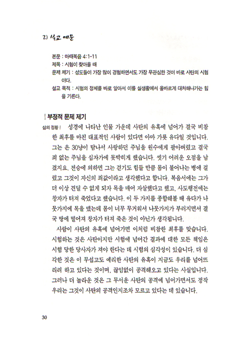 몸은 비록 교회에 와 있지만, 청중들이 설교 시간에 졸기 일쑤라거나 의도적으로 설교를 듣지 않으려 한다는 사실을 아는가? 왜일까? 아마도 그건 설교가 청중의 의식 수준이나 기대치에 미치지 못하기 때문일 것이다. 우리의 설교도 재조명해 보아야 한다. 신선한 설교 전개를 위해서 이제 고정관념의 틀을 깨고 다양한 설교 전개법을 익혀야 한다. 아무쪼록 본서로 말미암아 많은 목회자들이 새로운 설교 구성법에 눈을 뜨게 되기를 바란다.