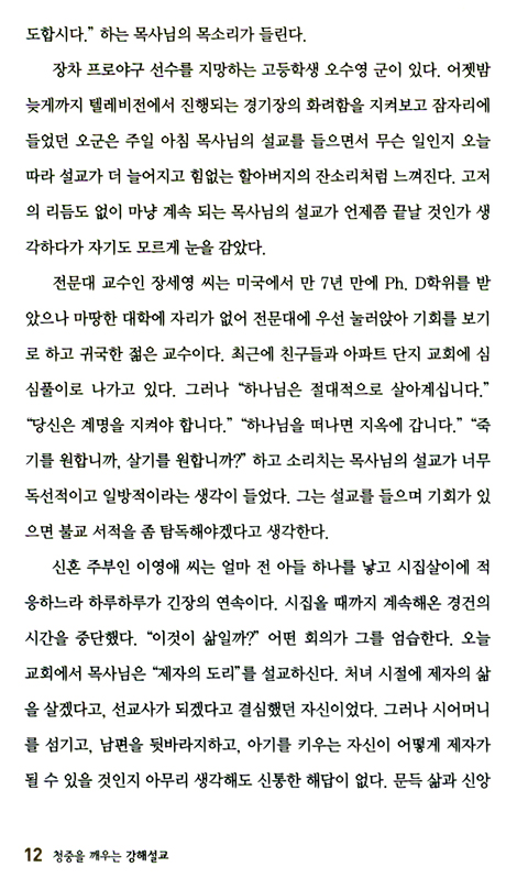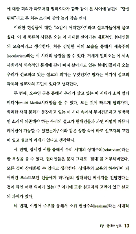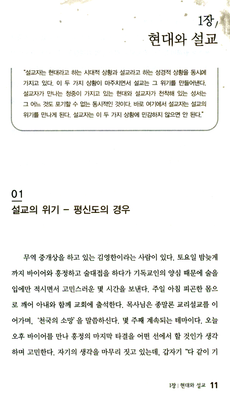 이 책은 설교의 방법론을 포함하지만 방법론에 주안점을 둔 것은 아니다. 차라리 ‘설교신학’이라고 할까, 급변하는 시대의 정황 속에서 설교자가 끌어안고 고뇌해야 하는 강단의 과제를 안고 전체적으로 접근해 보려고 한 것이다. 설교도 하나의 사건이라면, 이 사건을 가능케 하는 여러 요인들을 신학적이면서도 실제적인 측면에서 다루어보고 싶었다. 그리하여 설교자들의 설교위기를 진정한 설교의 기회로 승화시키고 싶었다.