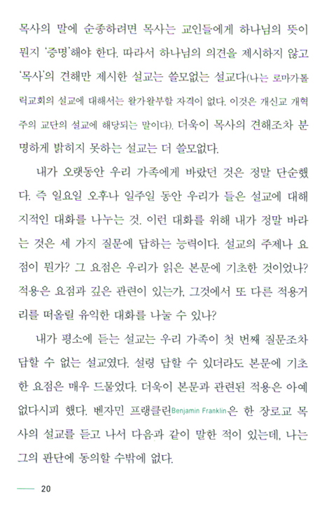 이건 나만의 문제가 아니다. 오늘날 실망스런 설교가 아주 흔한 것은 원칙을 모를 뿐 아니라 미디어 문화의 영향을 피할 수 없기 때문이다. 이 책은 유익한 대중문화 연구서이기도 하고 맞춤한 성경 해석서이기도 하다. 저자의 말에 움찔할 때도 있었지만 고마울 따름이다.