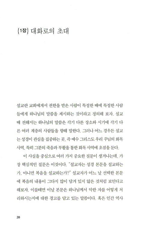 그런 사람은 없다. 그러나 이 도전을 받아들이는 설교자는 하나님께서 앞서 창조하신 생각 깊은 작가들을 통해 이 엄청난 주제들에 관한 지혜를 얻을 기회를 누린다. 이제 내가 이 작은 책자를 내놓는 것은, 위대한 작가들과의 대화에 여러분을 초대하고 싶어서이다. 이 대화에 참여한다면, 여러분의 삶이 달라질지도 모른다.