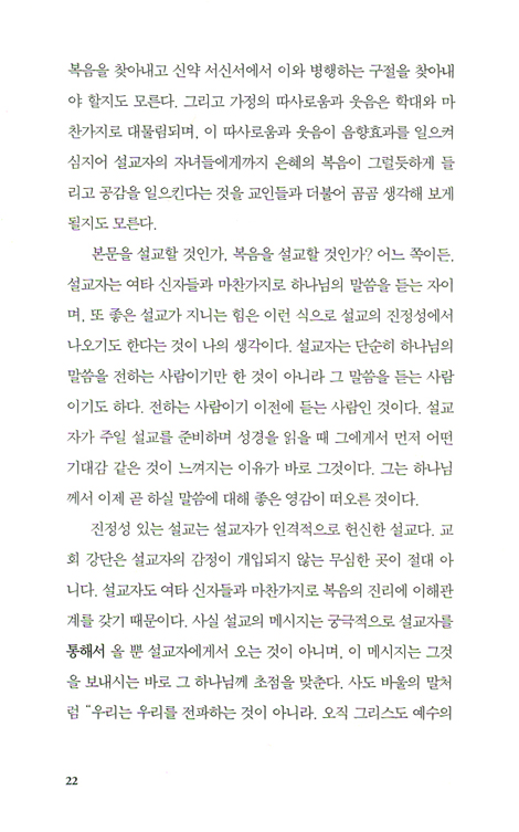 목사가 설교를 하면 이상한 일이 벌어진다. 예배가 끝난 뒤 사람들은 목사가 설교 때 이야기하지 않은 것에 대해서, 혹은 이야기를 했지만 청중들은 물론 목사 자신도 이해하지 못한 것에 대해서 감사한다. 시인 벤 빌릿이 언젠가 말한 것처럼, 우리가 하는 말은 “우리 자신보다 지혜롭고”, 이것이 어느 때보다 확실하게 실증되는 경우가 바로 성령께서 예배당에 임하실 때다.······ 그러나 설교가 이렇게 예측 불가능한 결과를 낳는다고 해서 설교를 즉흥적으로 해도 되는 것은 아니다. 어떤 설교자에게도 그런 허가증은 주어지지 않는다. 성실한 설교자는 열심히 설교 준비를 한다. 풍성한 결실은 하나님의 선물로 주어지는 것이지만, 열심히 준비하는 것은 설교자의 본분임을 인식하면서 말이다.