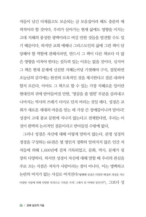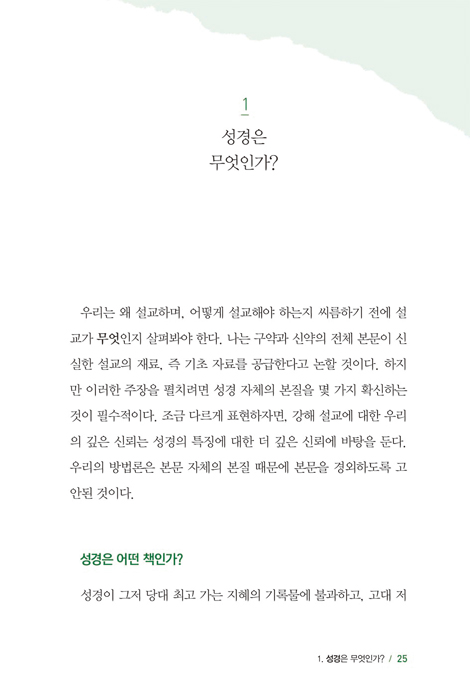 성경을 가르치고 전파하는 일은 레위 지파인 제사장의 사역, 선지자의 과업, 세례자 요한의 모든 수고, 예수님의 지상 사역, 제자들이 받은 명령, 바울과 디모데의 우선순위 중에서도 가장 두드러진다. 적어도 성경 시대에 설교는 사역의 중심이었다. 그리고 이 말은 오늘날에도 당연히 설교가 중심이 되어야 한다는 뜻이다. 그렇게만 되면 신약에서 교회에 임했던 그 능력이 우리에게 다시 임한다 해도 놀랄 일이 아니다. 1. 성경은 무엇인가?