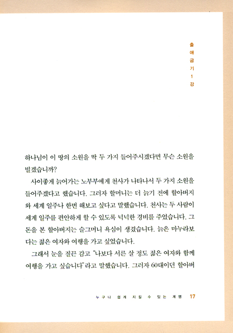 모든 범죄의 근본적인 해결책은 영적 생명을 회복하는 데 있습니다. 그 외에는 없습니다. 영적 생명을 회복할 때 억울함과 증오심으로부터 자유로워지기 때문에 살인하지 말라는 여섯 번째 계명은 나와 거리가 가장 먼 것이 됩니다. 덤으로 기쁨과 평강이 삶 가운데 임합니다. (…) 하나님을 알현하기 위해 예물까지 들고 제단 앞에 나왔더라도 형제와 불화한 것이 생각나거든 일어나 그 형제를 찾아가 화해한 다음 제단으로 오라고 하십니다. 형제와의 불화가 잘못된 것이라고 생각하는 자체가 하나님의 은혜입니다. 지금까지는 자기만 옳다고 생각했으니까요. 그래서 한 방 먹이면 잘한 것이고, 그렇지 못하면 분하고 억울하게 생각했으니까요. (본문 131~132p)