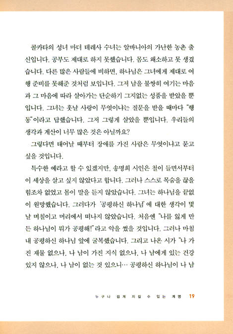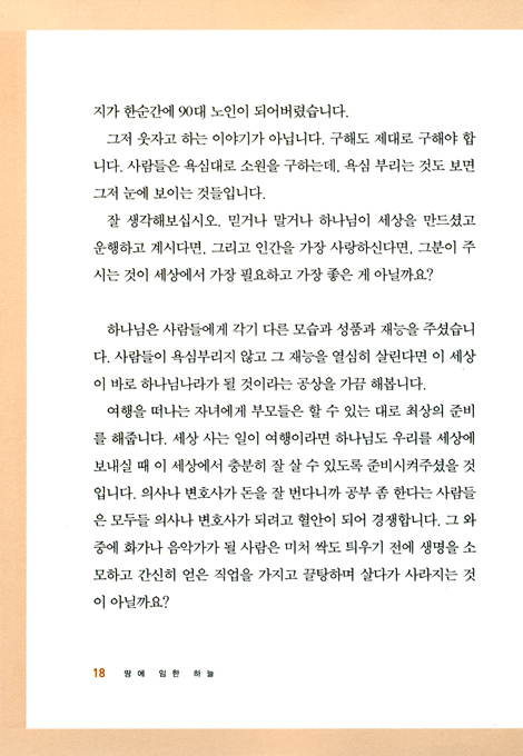 안식일은 원망과 불평을 ‘멈추고’ 하나님의 은혜를 헤아려보는 날입니다. 안식일을 거룩하게 지키라는 하나님의 명령에는 우선 ‘멈추라’는 깊은 뜻이 들어 있습니다. 돈 되는 일만 찾아 헤매는 발걸음을 멈추라는 것입니다. 남을 무너뜨려야 내가 살 수 있다는 생각을 멈추라는 것입니다. 멈추고 하나님을 바라보며, 하나님이 나를 만드신 이유가 무엇이며, 내게 주신 재능이 무엇이며, 내가 가장 잘할 수 있는 일이 무엇이며, 어떻게 하면 그것으로 나와 이웃을 살리며, 하나님께 영광을 돌릴 수 있을지 생각하라는 것입니다. (본문 91p)