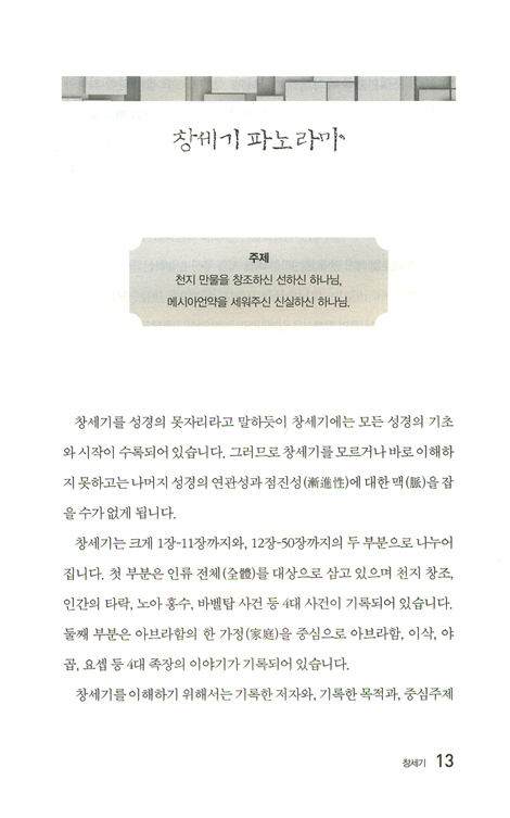 • 맨 앞에 전체를 한 눈에 바라볼 수 있도록 각 권의 “파노라마”를 실었다. 그런 연후에 장별 연구에 들어가면 전체 문맥 속에서 각 장을 파악하게 되므로 많은 도움이 될 것이다.