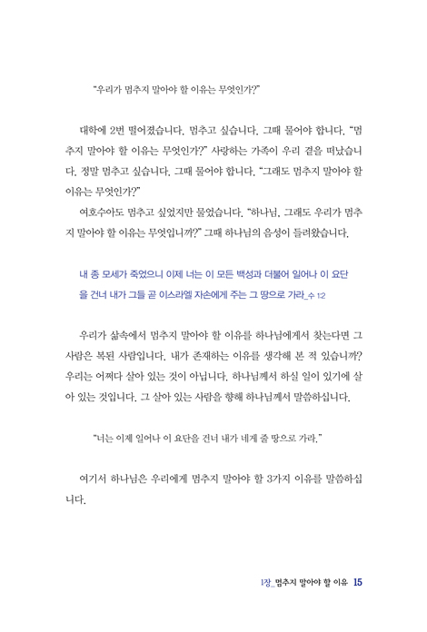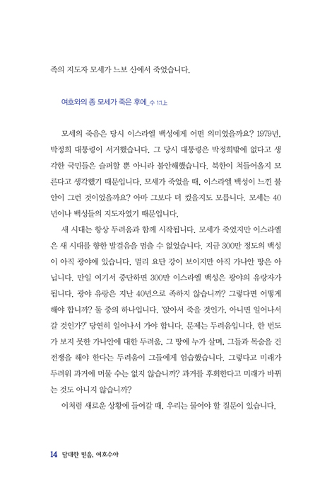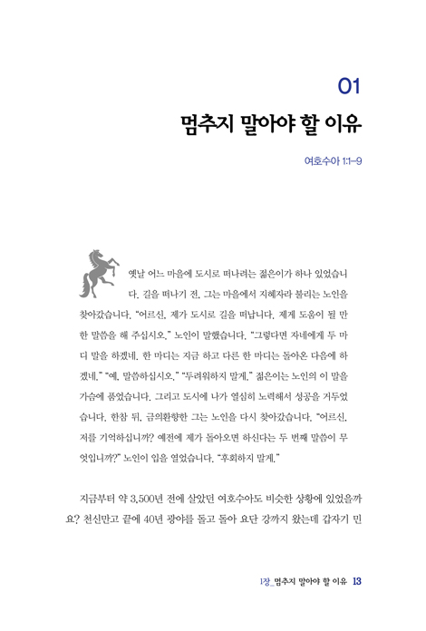 01 멈추지 말아야 할 이유 _여호수아 1:1-9 02 함께 가면 더 쉬운 길 _여호수아 1:10-18
