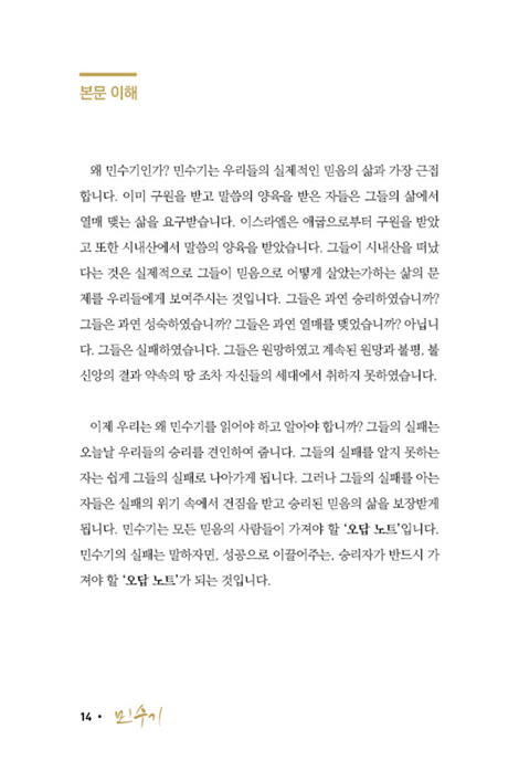 우리는 왜 민수기를 읽어야 하고 알아야 합니까? 그들의 실패는 오늘날 우리들의 승리를 견인하여 줍니다. 그들의 실패를 알지 못하는 자는 쉽게 그들의 실패로 나아가게 됩니다. 그러나 그들의 실패를 아는 자들은 실패의 위기 속에서 건짐을 받고 승리된 믿음의 삶을 보장받게 됩니다. 민수기는 모든 믿음의 사람들이 가져야 할 ‘오답 노트’입니다. 민수기의 실패는 말하자면, 성공으로 이끌어주는, 승리자가 반드시 가져야 할 ‘오답 노트’가 되는 것입니다.