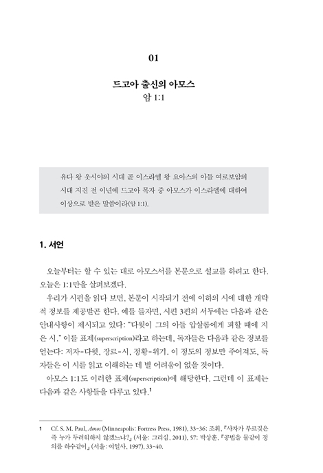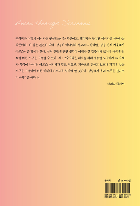 아모스서를 반드시 제1의 수사학적 관점에서 보아야 한다는 것은 아니다. 수사학은 어떻게 메시지를 구성하느냐는 학문이고, 해석학은 구성된 메시지를 해독하는 학문이다. 이 둘은 관련이 있다. 성경이 하나님의 설교라고 한다면, 성경 전체 가운데서 아모스서를 읽어야 한다. 성경 전반에 관한 신학적 이해가 잘 갖추어져 있어야 해석에 필요한 바른 도구를 사용할 수 있다. 제1, 2 수사학은 해석을 위해 유용한 도구이지 그 자체가 목적이 아니다. 아모스 선지자가 말로 전했고, 기록으로 전하고 있으니 거기에 맞는 도구를 사용하여 바른 이해에 이르도록 힘써야 할 것이다. ― 15쪽