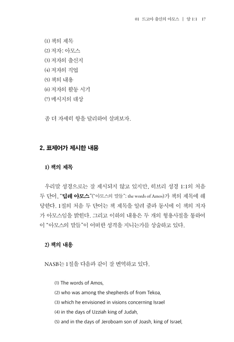 이제 아모스가 전한 첫 스피치 단락을 마무리하면서 그가 강조했던 두 가지 문학적 기법을 다시 한번 점검해 본다. Insinuatio와 penultimate twist가 그것이다. 전자는 우회적 서론이고, 후자는 일종의 파격성이다. 열방 신탁(암 1:3-2:5)은 이스라엘 신탁(암 2:6-16)을 효과적으로 전달하기 위한 장치인 반면, 후자는 마지막 결론(예컨대, 암 2:13-16)을 드러내기 위한 전종 단계(암 2:9-12)에서의 파격적 문학 기법이다. 아모스 선지자는 이처럼 적절한 수단을 통해 적합한 메시지를 전달하고 있는 것이다. 복음 전파를 위해 우리도 아모스 선지자의 지혜를 배워야 한다. ― 150쪽