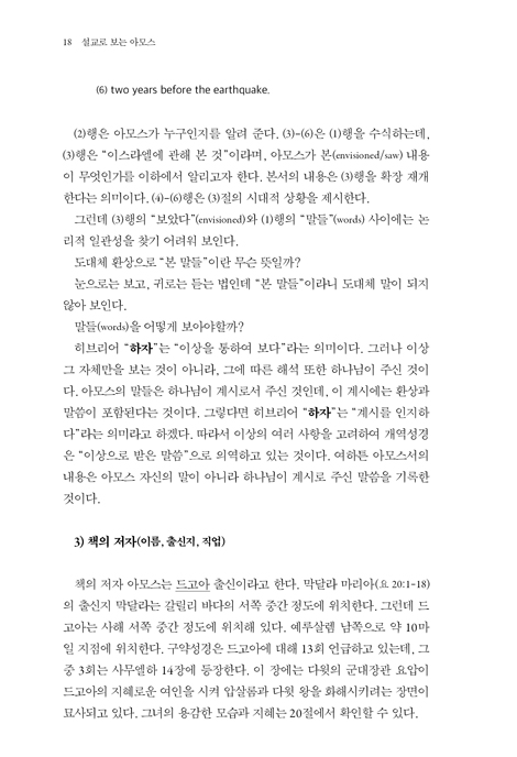 ‘서언—본문 분석—본문 해설—교훈’이라는 틀은 바로 선지자들이 백성에게 하나님의 말씀을 받아 대언하고, 해석해 주고, 적용의 원리를 가르치고 훈련시켰던 양식을 그대로 따른 것입니다. … 히브리어 단어를 자세히 풀이해 독자가 고대 언어에 이질감보다는 친밀감을 느끼도록 하고 있습니다. 한국에서 출판된 아모스 주석 가운데 유래를 찾아볼 수 없는 좋은 책이라고 생각해 이 책을 적극 추천합니다.