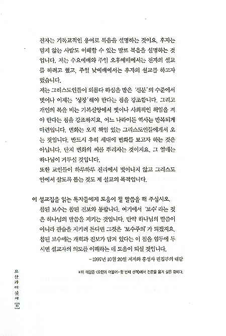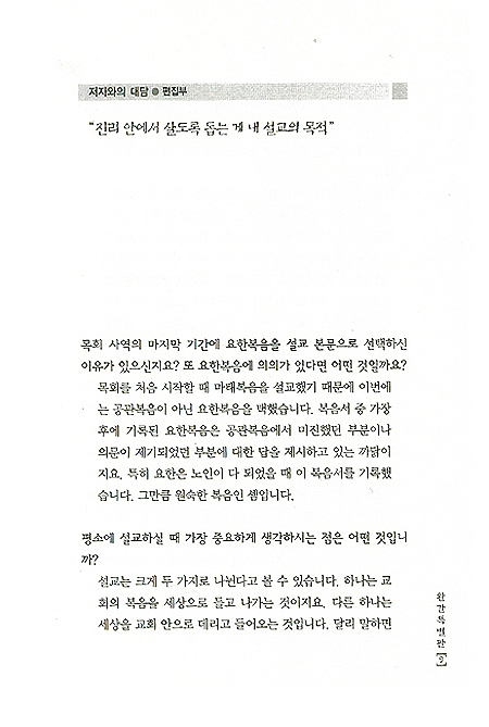 반면에 설교집이란 글을 통하여 설교를 눈으로 읽는 것입니다. 따라서 같은 내용의 설교이지만, 책으로 엮기 위해서는 말의 원고를 글의 원고로 바꿀 필요가 있었습니다. ....어쩔수 없이 틈이 나는 대로 원고를 가다듬다 보니, 이제야 완간을 맞게 되었습니다. "