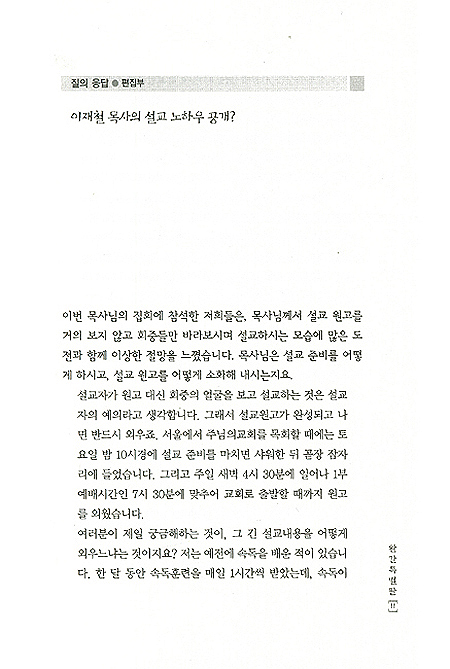 "저는 설교할 때마다 항상 완전한 원고를 작성하였습니다. 그러나 설교 전달의 방법이 말인 이상 그 원고는, 상대의 귀에 들려주기 위한 말의 원고였습니다.