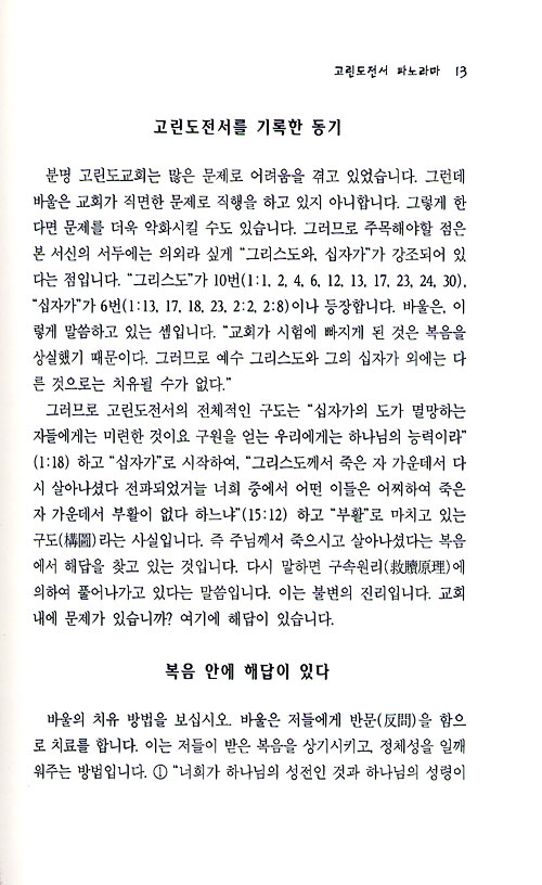 고린도교회는 문제가 많은 교회입니다. 교회 내의 문제는 왜 발생하는가? 바울은 그 원인을 복음을 잃어버렸기 때문으로 보고 있습니다. 그래서 "너희가 알지 못하느냐"(고전 6장) 하고 복음을 상기시킴으로 여러 가지 문제들을 복음으로 치료하고 있습니다. 그러므로 고린도전서는 현대교회 내의 문제들을 치료하는 지침서가 됩니다. 또한 고린도교회는 바울을 배척한 교회로도 유명합니다. 어찌하여 이런 일이 벌어졌는가? 복음이 변질(變質)이 되었기 때문입니다.
