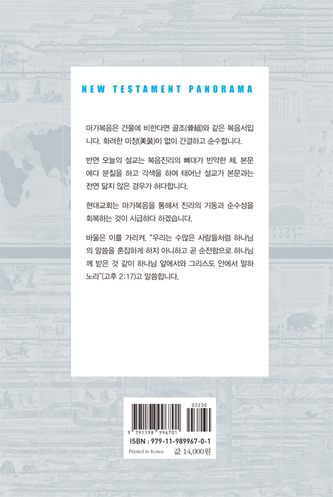 이런 의미에서 가장 좋은 강해는 설명은 적게 하고 본문을 최대한 그대로 살리는 것일 거라는 깨달음입니다. 이점을 다른 강해에서도 유념했습니다만 본서는 특히 마가복음의 간결하고 명쾌한 특성을 살리기 위해서 이를 명심하고 썼습니다.