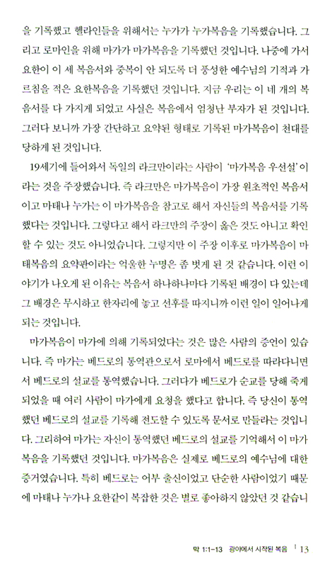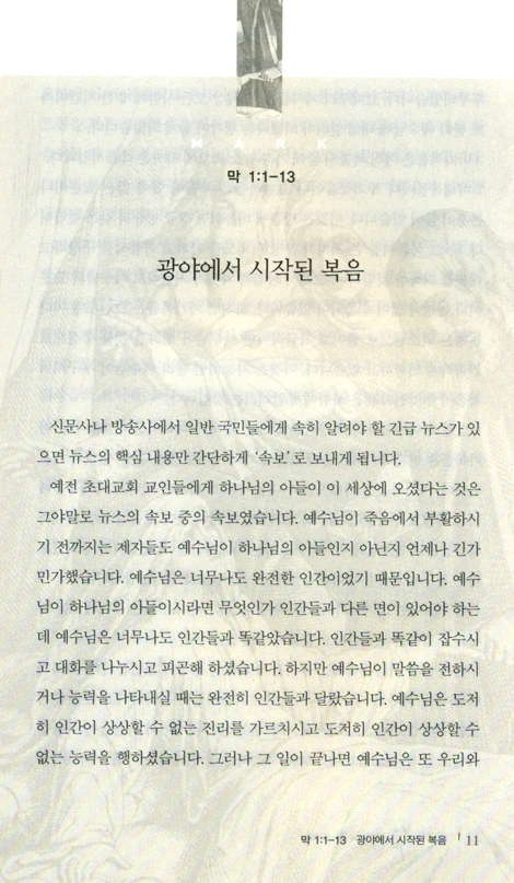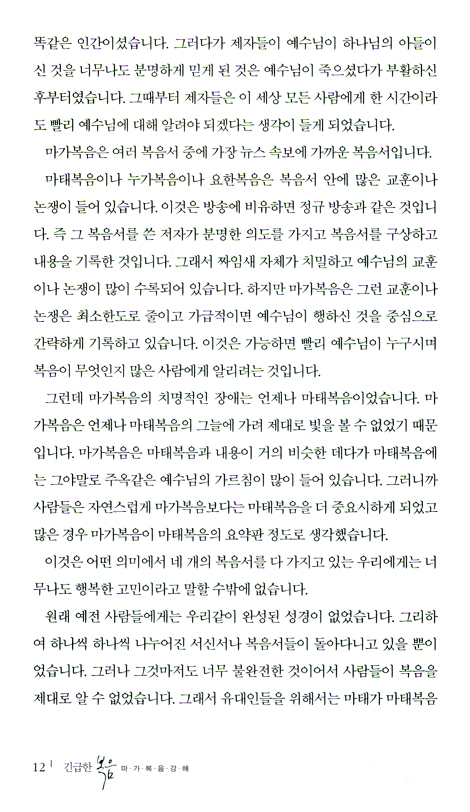 성경책이 다 출판되기 전에, 쪽복음이라고 해서 복음서가 하나씩 소책자로 인쇄되어 보급된 때가 있었다. 그때 가장 인기 있었던 복음서가 마가복음이었다. 왜냐하면 예수님이 행하신 일을 중심으로 일체의 군더더기 없이 가장 간략한 형태로 복음을 진술하기 때문이다. 특히 일반인이 문자를 많이 알지 못하던 때에 가장 잘 전달하고 배울 수 있는 복음이 마가복음이었다. 복음서는 나름대로 특정 대상을 목표로 기술된 것을 기억할 필요가 있다. 마태복음은 유대인 신자들을, 누가복음은 헬라인 신자들을, 마가복음은 로마인 신자들을 위해 기록된 것이다. 당시 로마인들이 가졌던 성향 자체가 복잡한 가르침보다 간결한 이야기체 중심의 복음이 적합했던 것 같다. 오늘날 현대인의 성향도 옛 로마인의 성향과 비슷한 것 같다. 현대인은 복잡한 논리는 싫어하고 실제적이고 드라마적인 것을 좋아하는 것 같다. 그래서 부인들은 가정에서 텔레비전의 드라마에 많이 빠지는 경향이 있다.