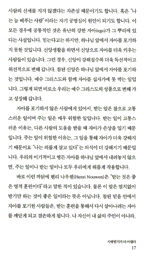 자아를 포기하지 않은 사람에게 있어서, 받는 일은 참으로 고통스러운 일이며 주는 일은 매우 위험한 일입니다. 받는 일이 고통스러운 이유는, 다른 사람의 도움을 받을 때 자아가 손상을 입기 때문입니다. 주는 일이 위험한 이유는, 그 일을 통해 자아가 더욱 강해지기 때문이요 “나는 의롭게 살고 있다”는 의식이 더 강해지기 때문입니다. 우리의 이기적이고 병든 자아를 하나님 앞에서 내려놓지 않으면, 주는 일이나 받는 일이나 모두 우리에게 해롭게 작용합니다.