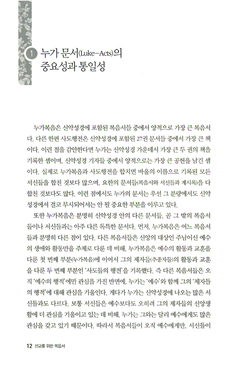누가는 예수의 제자들에 의해 많은 열매를 거두게 된 성공적인 이방인 선교가 순전히 초대 교회 사도들이 자의로 활동하여 이루어진 것이 아니라 예수의 선교적 비전과 명령에서 비롯되었으며, 실제로 예수의 사역 가운데서 이미 예수가 장차 사도행전에서 열매를 맺게 될 이방 선교의 씨앗을 여기저기에 뿌려놓았다고 증거한다. 이 책을 통해 누가복음과 사도행전을 기록하면서 가졌던 이방 선교 혹은 세계 선교에 대한 열정과 비전에 대해 새로운 이해를 가질 수 있게 되기를, 선교를 위한 성서적 지침이나 매뉴얼이 될 수 있기를 감히 기대해 본다. _서문 중에서