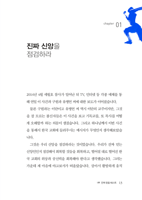 세월호 사건을 바라보며 제가 얻은 답은, 하나님께서는 지금 이 사건 앞에 우리를 흔들고 계신다는 것이었습니다. 지금 한국 기독교가 이래도 되는지 점검하기를 원하신다는 마음이 들었습니다. 우리가 말하는 신앙이 진짜인지 점검하라, 우리가 받은 구원이 진짜인지 점검하라, 그에 합당한 삶을 살고 있는지 점검하라, 지금 우리 교회가 정말 바로 가고 있는지를 점검하라고 하시는 것 같았습니다.