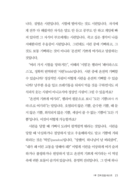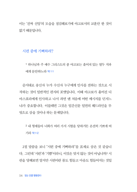 이 책은 제가 안식월을 마치고 돌아온 2014년 6월 29일부터 16차례에 걸쳐서 설교한 생생 신앙 시리즈 야고보서 강해 설교를 정리한 것입니다. 아무쪼록 이 책을 통해 예수님을 제대로 믿는 것이 어떤 것인지 다시 한번 확인하고, 살아서 활발하게 움직이는 진짜 신앙의 모습을 구체적으로 점검해볼 수 있기를 바랍니다.