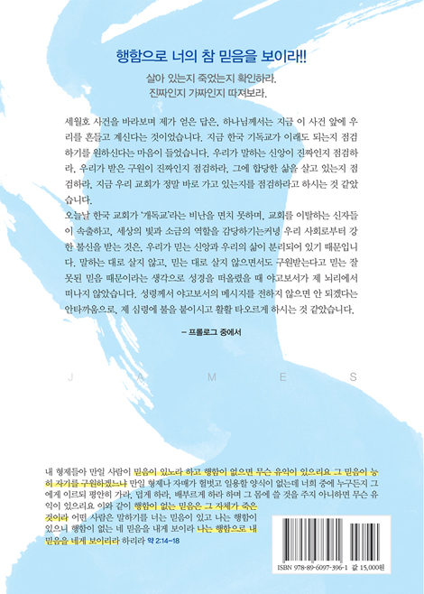 오늘날 한국 교회가 ‘개독교’라는 비난을 면치 못하며, 교회를 이탈하는 신자들이 속출하고, 세상의 빛과 소금의 역할을 감당하기는커녕 우리 사회로부터 강한 불신을 받는 것은, 우리가 믿는 신앙과 우리의 삶이 분리되어 있기 때문입니다. 말하는 대로 살지 않고, 믿는 대로 살지 않으면서도 구원받는다고 믿는 잘못된 믿음 때문이라는 생각으로 성경을 떠올렸을 때 야고보서가 제 뇌리에서 떠나지 않았습니다. 성령께서 야고보서의 메시지를 전하지 않으면 안 되겠다는 안타까움으로, 제 심령에 불을 붙이시고 활활 타오르게 하시는 것 같았습니다.
