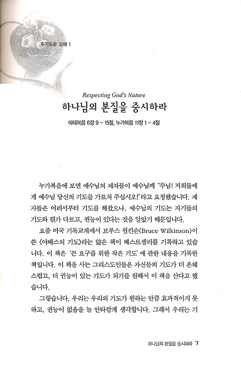 성경의 구약 시대부터 지금에 이르기까지 역사에 나오는 영적 거장은 모두 기도하는 사람드이었다. 예수님 역시 늘 기도하셨다. 예수님은 자신을 따르는 무리를 피하여 한적한 곳에서 기도하셨고(눅 5:16), 떄로는 산으로 가서 밤을 새워 기도하셨다(눅 6:12) 예수님의 공생애 사역을 가능하게 한 내적 원천은 기도였다. 스승의 기도하는 모습을 눈여겨본 제자들은 자기들에게도 기도하는 법을 가르쳐 달라고 요청하였다(눅 11:1). 그때 예수님이 가르쳐주신 주기도문은 단순한 기도문이 아니라 기독교 신앙의 진수가 들어 있다. 첫 부분에 나오는 하나님의 이름, 나라, 뜻은 복음의 핵심이며, 후반부에 나오는 일용할 양식, 죄 용서, 시험에 대한 경계는 실천 신앙의 기본이다. 본서는 주기도문을 이해하고, 기도에 새로운 눈을 뜨게 할 것이다