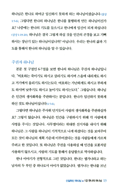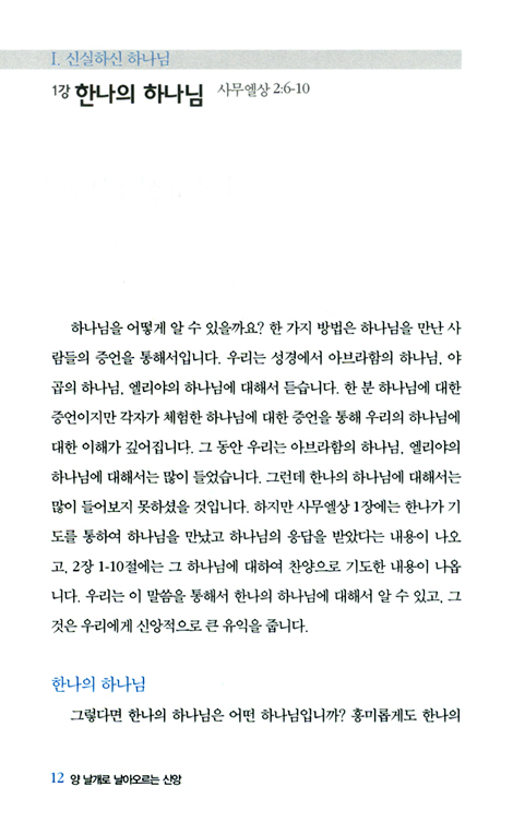 하나님을 어떻게 알 수 있을까요? 한 가지 방법은 하나님을 만난 사람들의 증언을 통해서입니다. 우리의 성경에서 아브라함의 하나님, 야곱의 하나님, 엘리야의 하나님에 대해서 듣습니다. 한 분 하나님에 대한 증언이지만 작자가 체험한 하나님에 대한 증언을 통해 우리의 하나님에 대한 이해가 깊어집니다. 그 동안 우리는 아브라함의 하나님, 엘리야의 하나님에 대해서는 많이 들었습니다. 그런데 한나의 하나님에 대해서는 많이 들어보지 못하셨을 것입니다. 하지만 사무엘상 1장에는 한나가 기도를 통하여 하나님을 만났고 하나님의 응답을 받았다는 내용이 나오고, 2:1-10에는 그 하나님에 대하여 찬양으로 기도한 내용이 나옵니다. 우리는 이 말씀을 통해서 한나의 하나님에 대해 알 수 있고, 그것은 우리에게 신앙적으로 큰 유익을 줍니다.
