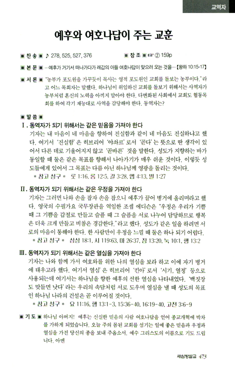 • 이 책의 참고 성구는 대지에 나타난 주제를 심도 있게 하기 위하여 신구약성경에서 그에 적합한 병행 관주 및 인물과 사건의 성구를 다루었으므로 가장 보편적인 진리를 가장 성경적으로 전하실 수 있도록 하였습니다.