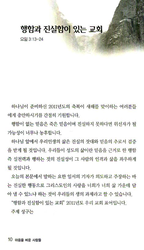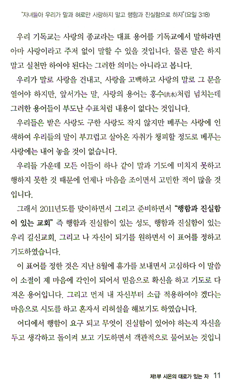 지난 한해(2011년)동안 주일 낮 예배 시간에 성도들과 은혜 받은 말씀을 고스란히 이 책에 담았습니다. 그러나 설교는 동일한 본문에 같은 설교자가 외쳐도, 들은 것을 또 듣는 것 같지만 사람에 따라 환경과 시간 따라 은혜가 되는 것을 체험을 했기에 긍지를 가지고 출판을 합니다.