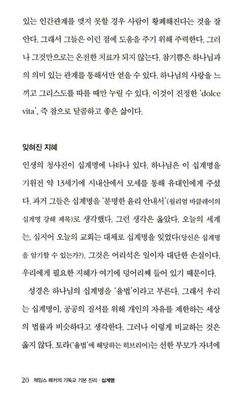 “우리의 육체는 복잡하지만 마음과 영혼은 훨씬 더 복잡하다. 우리에게도 창조자의 사용설명서, 즉 어떻게 살아가야 하는지 그 방법을 요약한 설명서가 있다. 바로 ‘십계명’이다. 우리가 한 인간으로서 성장하고 번성할지 아니면 주눅 들고 볼품없어질지, 우리 인격이 하나님을 닮을지 아니면 마귀를 닮을지는 우리가 십계명에 따라 살려고 하느냐 마느냐에 달렸다.”