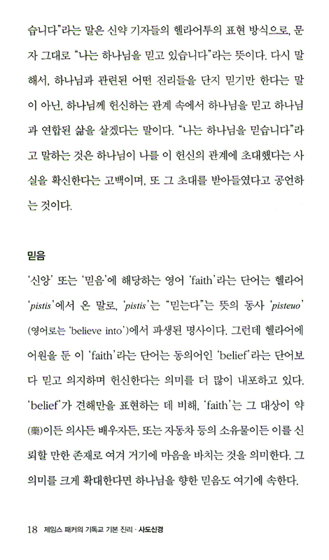 “내가 이 책을 쓰게 된 동기는 성경공부 모임에, 또는 그런 모임에 참여할 수 없어서 혼자 공부하는 사람들에게 필요한 자료를 제공하기 위해서다. 그런 견지에서 이 책은 숱한 성경공부 모임에 사용되고 있는 나의 책 「하나님을 아는 지식」과 짝을 이룬다. 이 책은 기독교의 가르침 가운데 항상 중심이 되는 세 가지 신조(信條)인 사도신경, 주기도문, 십계명 그리고 세례에 대한 내용으로 구성되었다. 각 부분은 마음만 먹으면 단숨에 소화해낼 수 있을 만큼 짧고 간략한 여러 소제목으로 이루어져 있고, 좀 더 심도 있는 학습을 위해 각 장마다 ‘스터디 가이드’를 실었다. 기독교는 본능적이지도 않으며 아무 노력 없이 우연히 선택할 수 있는 신앙이 아니다. 기독교는 배워야 하며 따라서 가르침이 필요하다.”