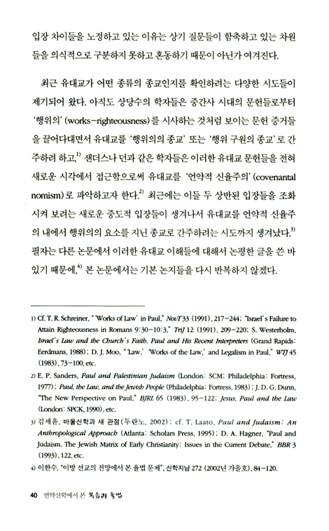 이책이 취급하는 "복음과 율법"의 문제는 멀리는 종교개혁가들 사이에, 가까이는 최근의 바울 연구가들 사이에 가장 열띤 논쟁의주제이기도 합니다.......바라기는 이 책이 단순히 최근의 논재을 소개하는 정도가 아니라, 오히려 논쟁을 유발시키는 근원적인 문제들, 이를 테면 바울 당대의 유대교의 정체성, 바울이 유대교를 비판한 근본 이유, 율법과 복음, 옛 언약과 새 언약, 율법과 성령과의 상관관계에 대한 보다 명쾌한 답변을 제공하여 줄 것을 바라마지 않습니다.바울에 관심이 있는 사람들이라면 진지하게 일독 할 것을 권합니다.