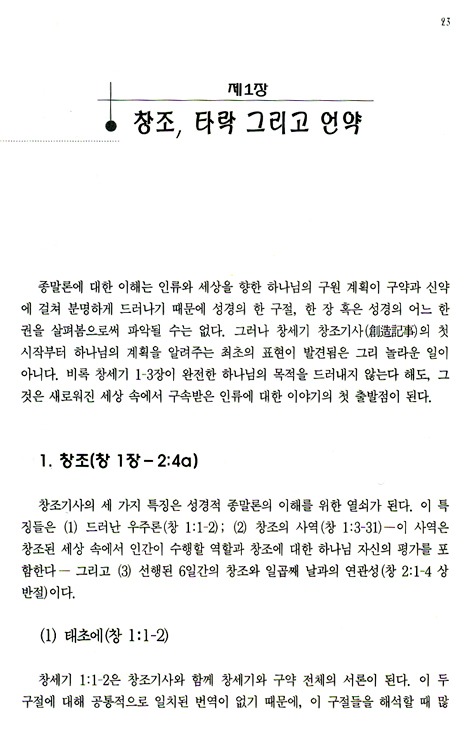 그는 천지창조와 인간창조와 타락으로부터 시작하여 구약의 구속사를 꿰뚫으면서, 신약 종말론의 기초를 구약 역사와 신학 속에 놓고 있다. 특히 구약의 뼈대를 이루는 출애굽, 시내산 언약, 시온신학을 종말론적인 관점에서 다룰 뿐 아니라, 포로기를 중심으로 그 전과 후 그리고 ‘묵시문학적’ 종말론까지 포괄적으로 다루고 있다.