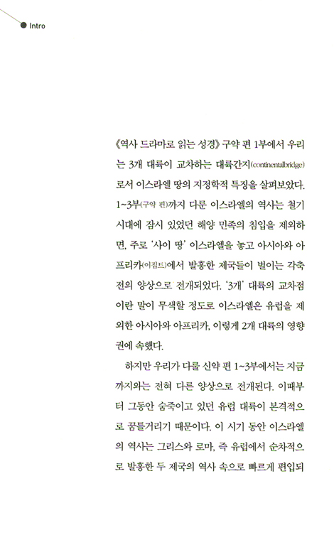 《역사 드라마로 읽는 성경》 ‘신약 편’은 알렉산더 대왕의 등장으로 시작되는 그리스(헬라) 시대부터 다루게 된다. 물론 신약성경 자체만 놓고 본다면 마태복음을 비롯한 사복음서의 배경이 되는 로마 시대로 직행하는 것이 옳을 것이다. 하지만 말라기서의 배경이 되는 페르시아 시대부터 마태복음의 배경이 되는 로마 시대 사이에는 무려 300년 이상의 역사적 간극이 존재한다. 페르시아 시대에서 곧바로 로마 시대로 직행할 경우 우리는 소위 말하는 ‘신구약 중간사’ 부분에서 거대한 ‘블랭크’ (blank,공백)를 만나게 된다. ‘신구약 중간사’는 종종 ‘신약성경 배경사’란 말로도 표현된다. 이것은 신구약 중간기의 역사가 신약성경을 이해하는 데 있어 중요한 역사적, 종교적 그리고 사회적 배경이 되기 때문이다.
