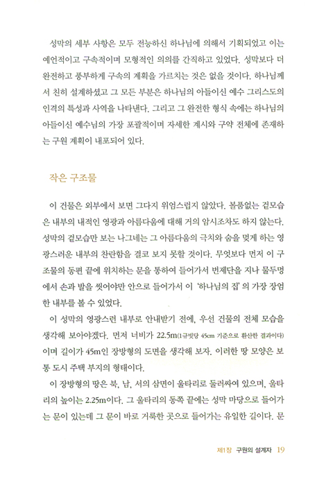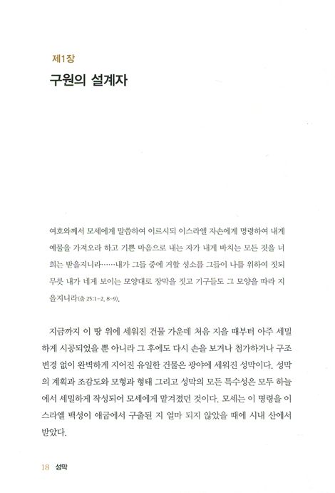 구주 에수 그리스도의 그림자인 성막에 관해 상세하게 해설한 이 책을 읽으면서 우리는 대속의 은혜를 돌이켜 깨닫고 더더욱 그리스도 악리를 앙망하며 성화의 길을 걷는 동기를 환기시킬 수 있다. 하나님께서 치명적인 죄의 대가를 해소하고 화목의 길을 여시기 위해 창세 전부터 작정하신 가슴 벅찬 대속의 비밀을 들여다보고 죄에서 벗어나 하나님 안에서 완전한 안식과 화평을 누릴 수 있는 복음의 은혜를 되새길 수 있다.
