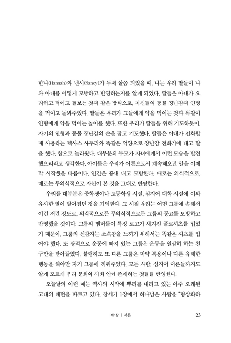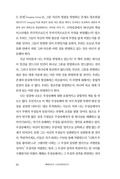 앞으로 우리는 우상들이 어떤 특정한 방식으로 묘사되고, 또한 그 우상을 숭배하는 자들이 정확히 같은 방식으로 묘사되는 예들을 다수 살펴볼 것이다. 이 동일한 묘사의 목적은, 우상숭배자가 자신이 기대하는 생명을 주는 복을 경험하는 대신, 우상처럼 영적으로 무감각하고 공허하고 반역적으로 되며 수치를 당함으로써 저주받는다는 사실을 조롱하며 표현하는 것이다. 예를 들어 우상이 볼 수도 들을 수도 없는 눈과 귀를 가졌다고 묘사될 때, 그 우상을 숭배하는 자 역시 눈과 귀를 가졌지만 보지도 듣지도 못한다고 그려진다. 동시에 나는 우상숭배자와는 반대로, 참된 하나님을 예배하는 자가 어떻게 복 가운데서 그분의 형상을 반영하는지에 대해서도 초점을 맞출 것이다. 인간은 참 하나님이든지, 혹은 피조 질서 가운데 있는 어떤 다른 대상이든지 그가 궁극적으로 자신의 모든 것을 헌신하는 대상을 반영하게 된다. 그러므로 되풀이하자면 이 책의 주제는, 우리는 우리가 숭상하는 것을 닮음으로써 멸망을 초래하든지 회복을 얻든지 한다는 것이다.(제1장 중에서)