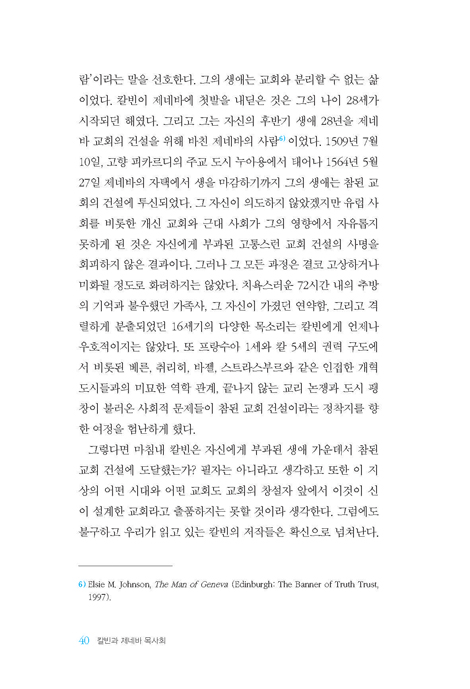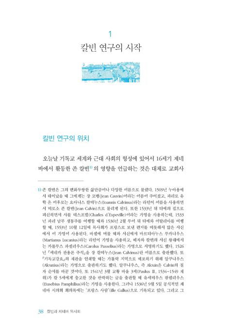 따라서 본서는 존 칼빈의 생애를 제네바 이전과 제네바 이후로 구분하고 제네바를 분수령으로 삼아 다음과 같은 순차적인 방식으로 전개될 것이다. 칼빈의 생애에서 수원지는 바로 제네바에 도착하기 이전의 생애, 즉 모친의 부재로 결핍된 영양을 인문주의의 모유로 공급받아 개혁자로 준비된 기간으로, 그가 거쳐 온 모든 체류지는 제네바 사역을 완성으로 이끌기 위한 준비 과정으로, 그리고 그에게 있어 정착지는 인문주의의 투사로 헌신했던 제네바로 설정될 것이다. 이에 본서에서는 그의 족적을 수원지(서론), 체류지(선행 연구), 정착지(제네바 목사회), 종착지(결론)로 설정하고 그 흐름을 따라 이 연구의 논지를 전개할 것이다.