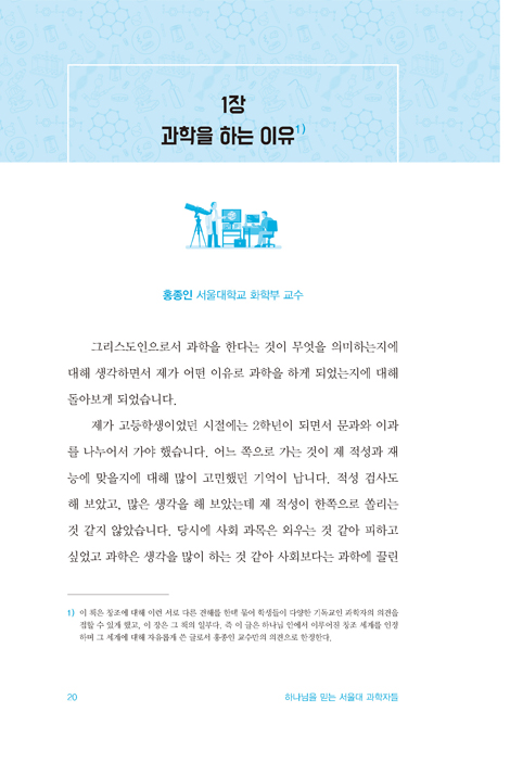 이 책은 이 질문에 대해 먼저 고민한 사람들, 그리고 적극적으로 대답하려는 과학자들의 이야기입니다. 한국에서 최고의 지성인이라 꼽히는 서울대학교에서 과학을 하는 이 사람들은 어떻게 하나님을 인정하는지, 그 이야기에 귀를 기울여 봅시다.
