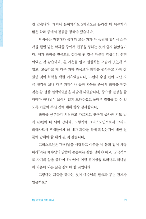 ‘하나님이 살아 계시다’는 것을 과학을 하는 사람들을 통해서 알리고자 합니다. 우리나라 최고 지성인으로서 ‘나의 하나님과 과학’을 알리고 싶습니다. 그래서 학생들이 어떤 이론을 접하면서 신앙을 떠나는 일, 고등학교 수업 시간에 무신진화론을 배우다가 교회에서 배운 창세기에 의심이 생기는 일, 창세기를 읽다가 고민에 빠지는 일 등을 극복하는 데 이 책이 디딤돌 역할을 하기를 기대합니다. 때로 이 고민에서 헤어 나오기 어려울 때, 이 책에 있는 사람들을 찾아가기를 권합니다. 이들은 여러분이 고민의 늪에서 빠져나오게 할 수 있을 것이며 여러분에게 좋은 멘토가 되어 줄 것입니다. 무엇보다 함께 고민해 주고 기도해 줄 것입니다.