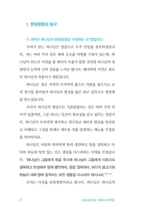 이 책의 저자들은 서울대학교에서 과학을 하는 사람들 중에서 “태초에 하나님이 천지를 창조하시니라”(창 1:1)를 믿으며 사는 사람들입니다. 이 책은 이 신앙의 토대 위에 창조에 대한 다양한 의견을 엮었습니다. 창조에 대한 이런 서로 다른 견해를 한 책에 묶어 학생들이 다양한 그리스도인 과학자의 의견을 접할 수 있도록 했습니다. 한 권으로 엮여 있으나 각 장은 그 사람의 의견으로 한정하여 보는 것이 타당합니다. 이처럼 이 책은 하나님 안에서 이루어진 창조 세계를 인정하고 자유롭게 쓴 글입니다. 완벽한 잣대에 비춰 보면 부족한 점이 있을 수 있습니다. 그러나 하나님이 이 세상을 창조하셨음을 드러내고자 하는 글이기에 하나님이 이 글을 보시며 좋아하실 것이라고 생각합니다.