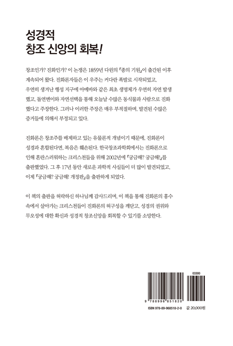 이 시대는 진화론이 과학이라고 믿게 하는 시대이다. 많은 기독교인들은 하나님의 창조를 믿고 싶지만, 진화론을 비롯한 수많은 정보 속에서 의문과 혼란을 경험하게 된다. 창조와 진화를 논쟁과 다툼으로 비하하거나 방임하는 경우도 많다. 지금은 깨어 시대를 분별해야 한다. 세상을 따르지 않고 오직 하나님의 진리의 말씀을 붙잡고 살아가야 한다. 진리와 사실과 이론의 혼재와 수많은 오해 속에서 분별이 필요하다. 오직 성경이 진리의 기준이며 진리 되신 예수그리스도 안에서 분별할 수 있어야 한다. 분별에 지식이 필요한 시대이다. 믿음에 덕을, 덕에 지식을 더하여 믿음이 견고해 지길 간구한다. 솔직한 궁금증과 물음은 건강하다. 물음에서 멈추지 않고 그 답을 찾아나가려는 걸음의 수고를 아끼지 않아야 한다. 부디 이 책이 한국의 많은 교회 성도들에게 널리 읽혀져서 창조과학에 대해 궁금했던 많은 부분과 오해들이 해소되는 기회가 되길 소망한다. 막혔던 성경의 맥이 뚫리고, 믿겨지지 않았던 성경말씀이 하나님의 진리의 말씀으로 믿고 고백하는 역사가 일어나길 기도한다.