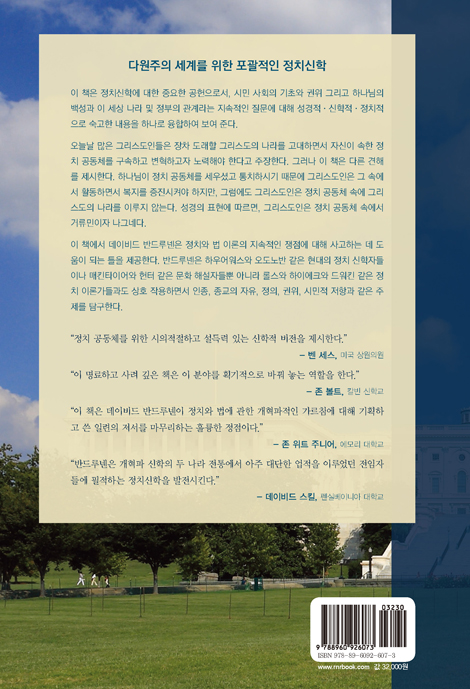 이 책은 정치신학에 대한 중요한 공헌으로서, 시민 사회의 기초와 권위 그리고 하나님의 백성과 이 세상 나라 및 정부의 관계라는 지속적인 질문에 대해 성경적·신학적·정치적으로 숙고한 내용을 하나로 융합하여 보여 준다.
