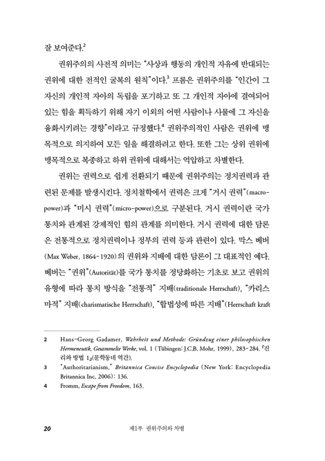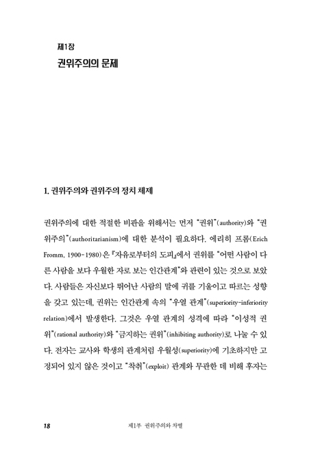제1부에서는 기독교 근본주의와 기독교 파시즘의 기반이 되는 권위주의적 종교의 특징을 살펴본다. 권위주의적 종교는 인간에 대한 통제력에 집착하며 추종자에 대한 억압을 통해 작동한다. “권위주의”와 “차별 기제”는 권위주의적 종교의 대표적인 특징이다. 이 책은 기독교 근본주의와 기독교 파시즘에 대한 비판의 출발점으로서 권위주의와 차별 기제를 정치신학의 관점에서 분석한다. 권위주의에 물든 기독교 근본주의자는 카리스마적 권위를 표출하는 종교 지도자(혹은 집단)에 쉽게 매력을 느끼기에 종교 중독에 빠질 가능성이 높고 더욱 강력한 권위를 추종하는 경향을 보이기에 “정치적 종교”로서 파시즘에 거부감을 느끼지 않는다.