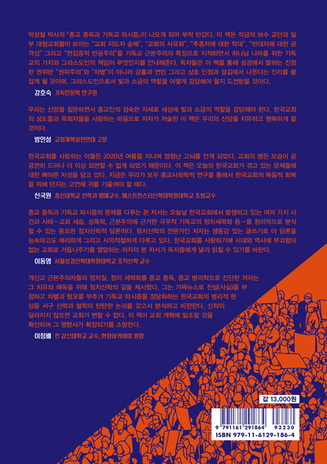 2020년을 강타한 코비드-19(COVID-19) 팬데믹은 한국 사회에 큰 충격을 안겨다 주었다. 특히 한국교회의 주류로 자리 잡은 기독교 근본주의자들이 방역 당국과 지속적으로 대립각을 세우면서 한국교회는 사회적 신뢰를 상실한 채 몰락의 위기에 처해 있다. 팬데믹 초기에 기독교 근본주의자들은 정부의 일시적인 집회 금지 권고를 “종교 탄압”과 “기독교 박해”라는 프레임으로 맞서며 회중 예배와 종교 행사를 강행하였고 속칭 “태극기 집회”에 강박적으로 참여하면서 집회 주동자들의 정치적 선동에 맹목적으로 동조했다. 이러한 현상들은 기존의 일반적인 신학적 방법론으로는 그 원인을 설명할 수 없다. 이러한 가운데 팬데믹으로 인해 극대화되고 있는 한국교회 내 반사회적인 현상을 정치신학의 관점에서 분석한 책이 출간되었다.
