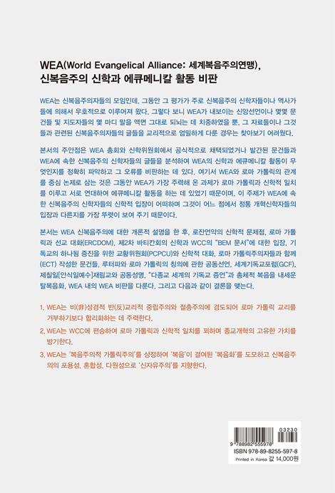 WEA는 신복음주의자들의 모임인데, 그동안 그 평가가 주로 신복음주의 신학자들이나 역사가들에 의해서 우호적으로 이루어져 왔다. 그렇다 보니 WEA가 내보이는 신앙선언이나 몇몇 문건들 및 지도자들의 몇 마디 말을 액면 그대로 되뇌는 데 치중하였을 뿐, 그 자료들이나 그것들과 관련된 신복음주의자들의 글들을 교리적으로 엄밀하게 다룬 경우는 찾아보기 어려웠다. 이 점에 대한 인식이 WEA로 인하여 야기되어 온 절박한 신학적 상황에 대한 우려에 더하여져 필자는 칼빈과 그의 신학을 계승·심화시킨 개혁신학자들의 후예로서 그리고 강단에서 성경의 참교리를 가르치는 조직신학자로서 본서의 저술에 대한 하나님의 뜻을 구하게 되었다.
