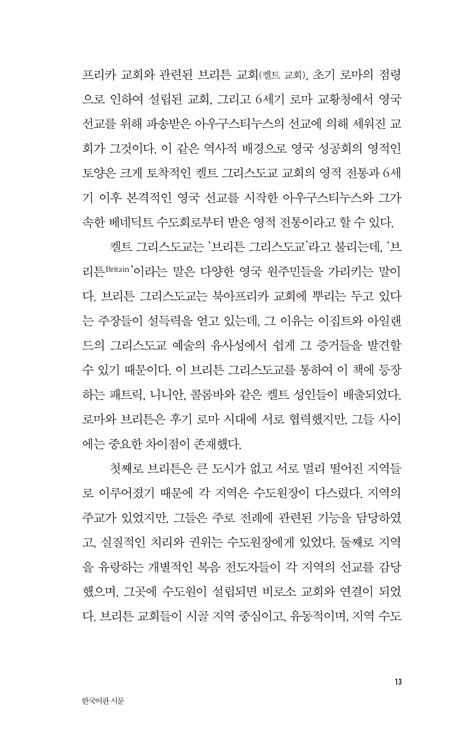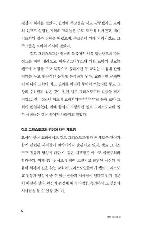 필자는 켈트 그리스도교 전통과 영성에서 이 시대의 교회와 그리스도인들이 발견할 수 있는 가장 큰 선물은 무엇보다 생태적 감수성이라고 본다. 기후 위기와 지구촌에서의 인류의 지속 가능한 삶이 위협받고 있는 지금, 교회가 회복해야 할 가장 시급한 과제로 생태적 영성과 감수성에 대한 중요성은 아무리 강조해도 지나치지 않을 것이다. -p.15(“한국어판 서문”)