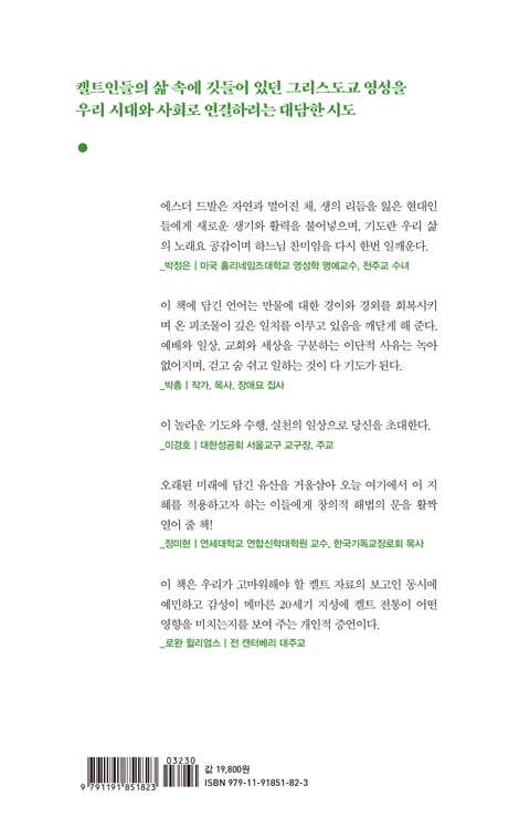 지금도 불안과 불확실성을 안고 살아가는 우리의 영적 여정에 켈트 그리스도교의 전통과 영성은 확실히 생기와 활력을 주는 큰 원동력을 제공한다. 나를 온전하게 담는 기도, 내 인격을 충만히 아우르는 기도, 말로 하는 기도에서 나아가 이미지와 상징을 사용하고 깊은 상상력의 샘에 이르러 마음과 감정을 다해 기도하는 법을 알려 준다. 무엇보다 그리스도인의 기도 여정에 필요한 영감에 대한 깊은 이해와 배움을 풍부하고 사려 깊게 들려준다.