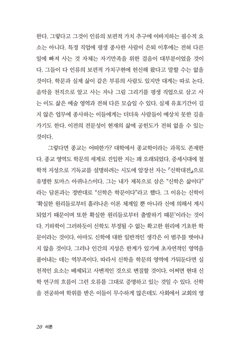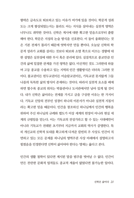 신학은 도서관이나 서재에 쌓아두고 필요할 때만 꺼내 보는 참고서용이 아니다. 실질적으로 학문으로서 신학은 전문인들의 영역에 갇혀있음이 사실이다. 그러나 삶으로 구현되어야 하고 실행되는 신학은 치열한 삶의 현장에서 펼쳐져야 한다. 그것이 하나님과 동행한다는 의미일 것이다. 하나님의 인격과 성품이 의향과 뜻이 그와 함께하는 자의 인격으로, 성품으로, 의향으로, 의지로 표출되는 것이다.